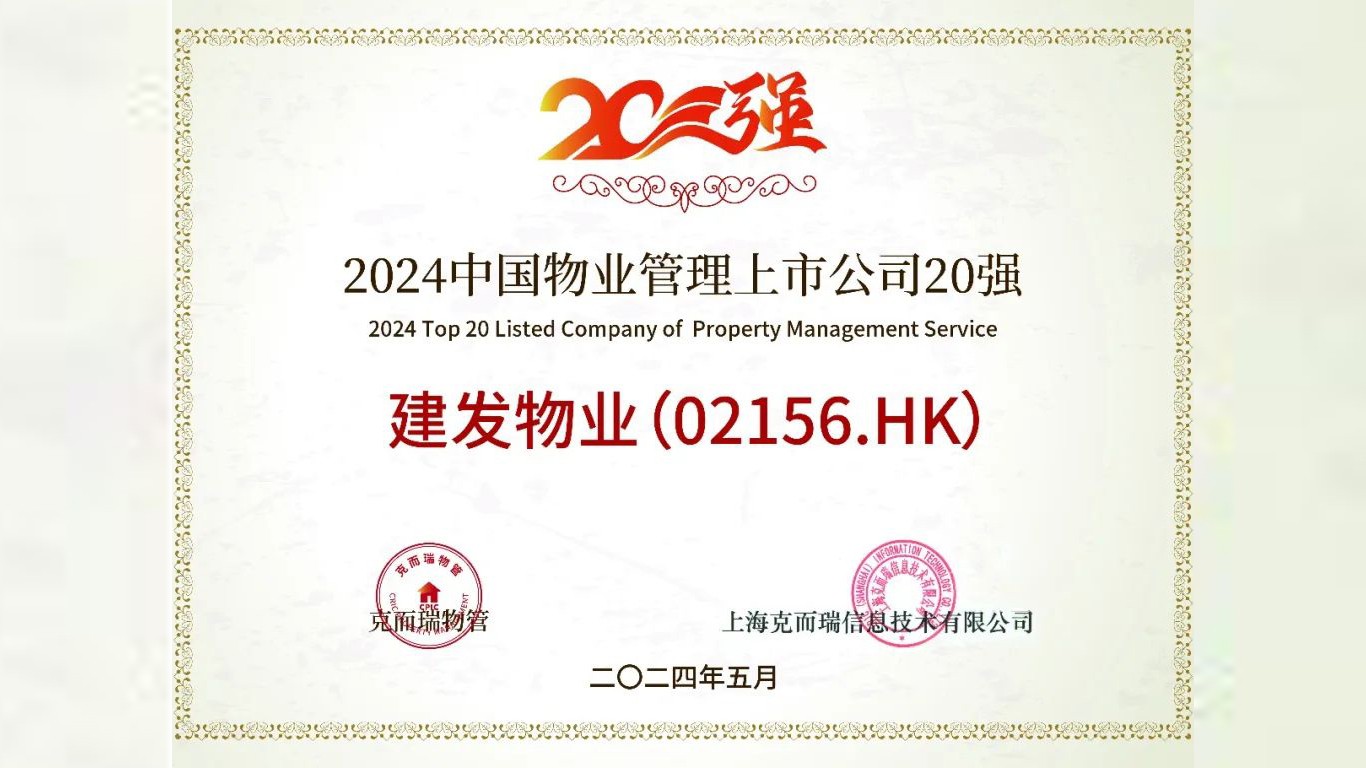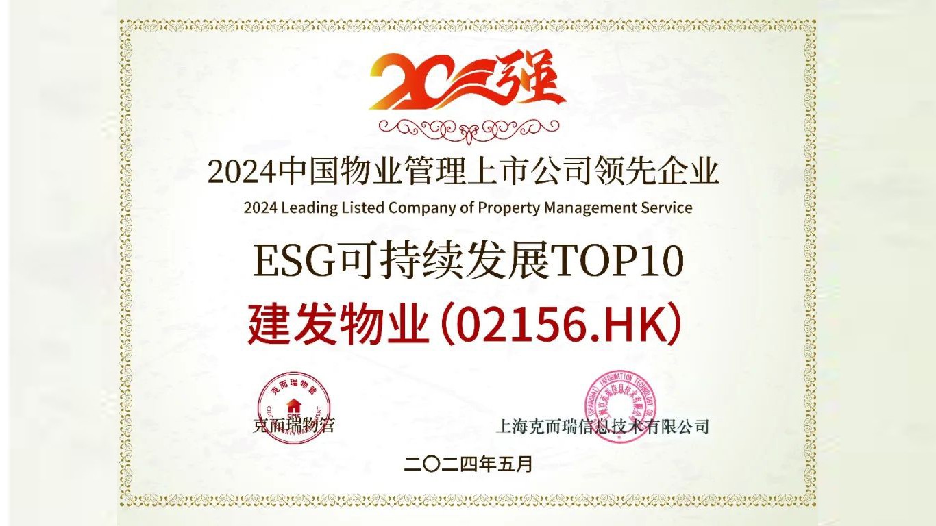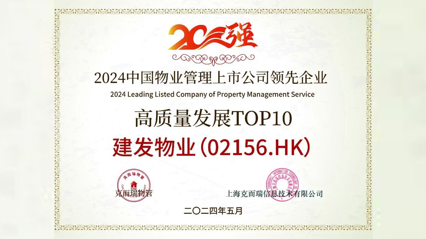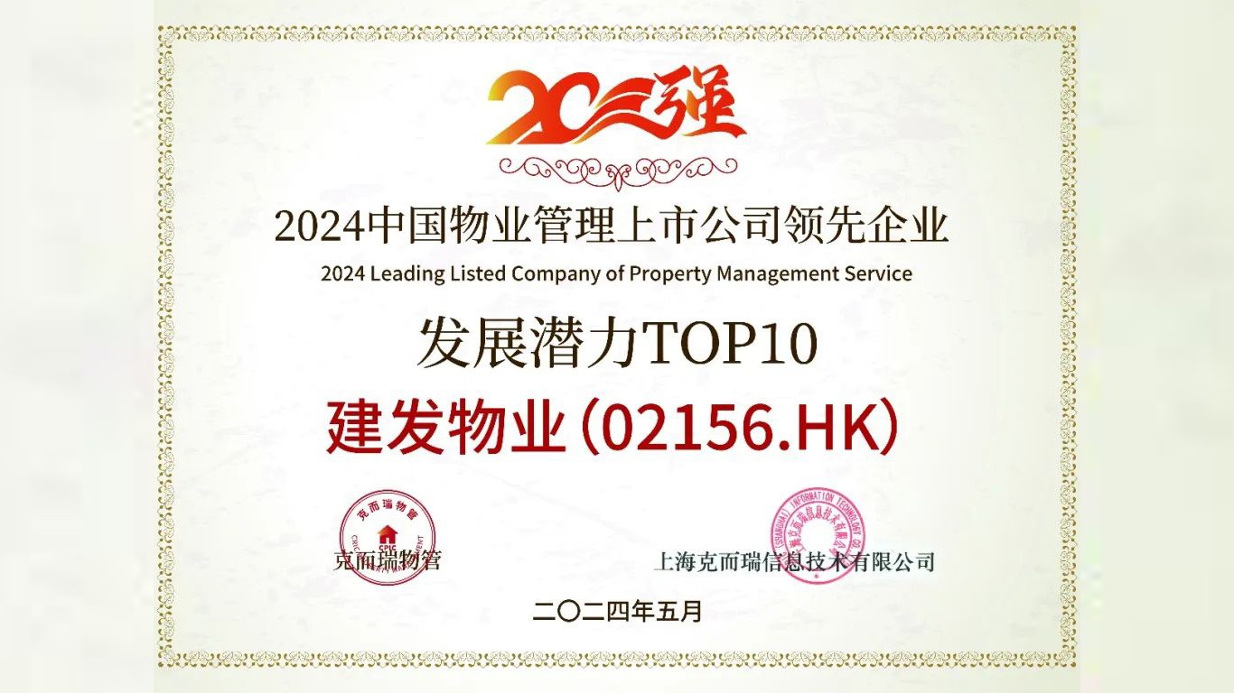 現(xiàn)場(chǎng),克而瑞發(fā)布了“2024中國物業(yè)管理上市公司系列測(cè)評(píng)成果”,其中,建發(fā)物業(yè)位列2024中國物業(yè)管理上市公司20強(qiáng)第10位、盈利規(guī)模TOP10第8位、市值認(rèn)可TOP10第9位、發(fā)展?jié)摿OP10第1位,并獲評(píng)高質(zhì)量發(fā)展領(lǐng)先企業(yè)、ESG可持續(xù)發(fā)展領(lǐng)先企業(yè)。
