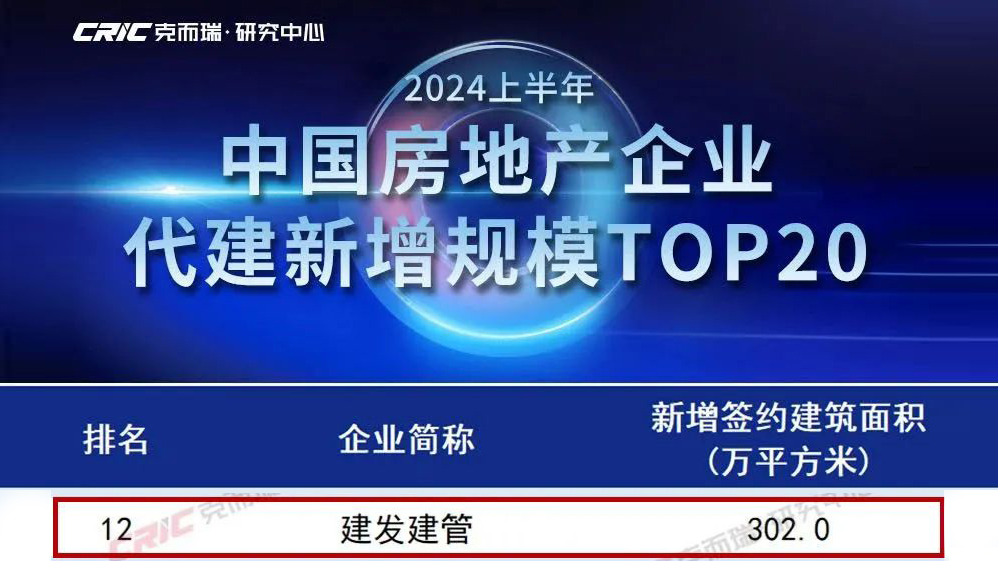 近日,克而瑞研究中心發(fā)布“2024上半年中國(guó)房地產(chǎn)企業(yè)代建排行榜”,建發(fā)建管憑借在代建領(lǐng)域的卓越表現(xiàn)及專業(yè)實(shí)力,位列中國(guó)房地產(chǎn)企業(yè)代建品牌傳播力TOP8及中國(guó)房地產(chǎn)企業(yè)代建新增規(guī)模TOP12。