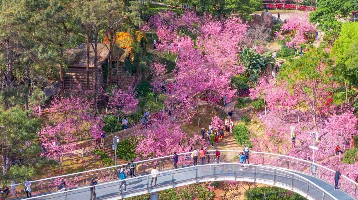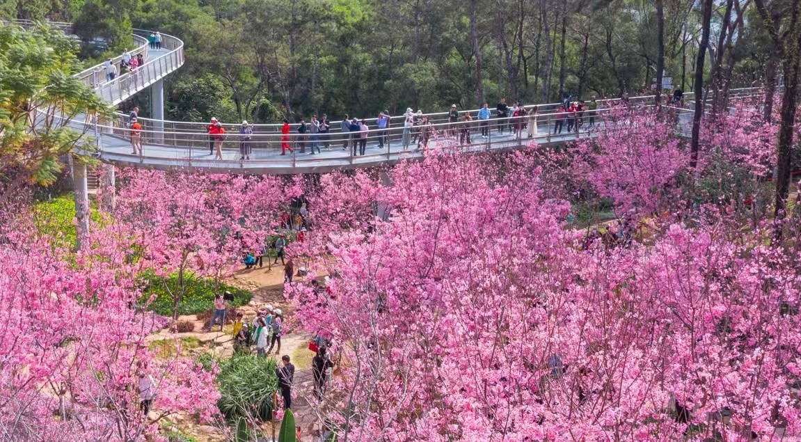 近日,建發(fā)城服所屬山海步道公司負(fù)責(zé)管養(yǎng)的云海線狐尾山段櫻花谷內(nèi),上百株櫻花進入盛花期。此處種植的櫻花以廣州櫻為主,花期預(yù)計持續(xù)到3月底。